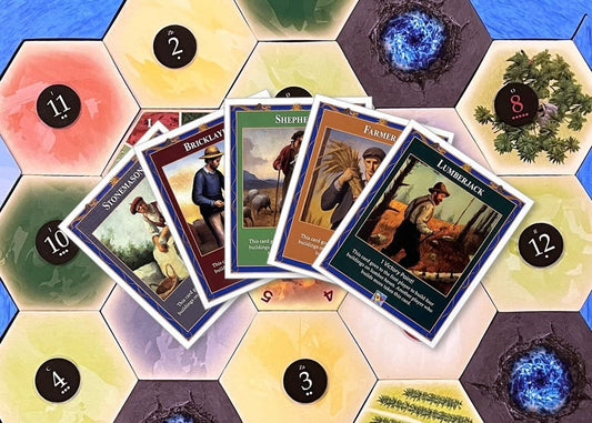 Professions Victory Point Cards, Bricklayer, Stonemason, Farmer, Shepherd, Lumberjack, compatible with Catan's Settlers of Catan 5th Edition, Seafarers and Catan Expansions