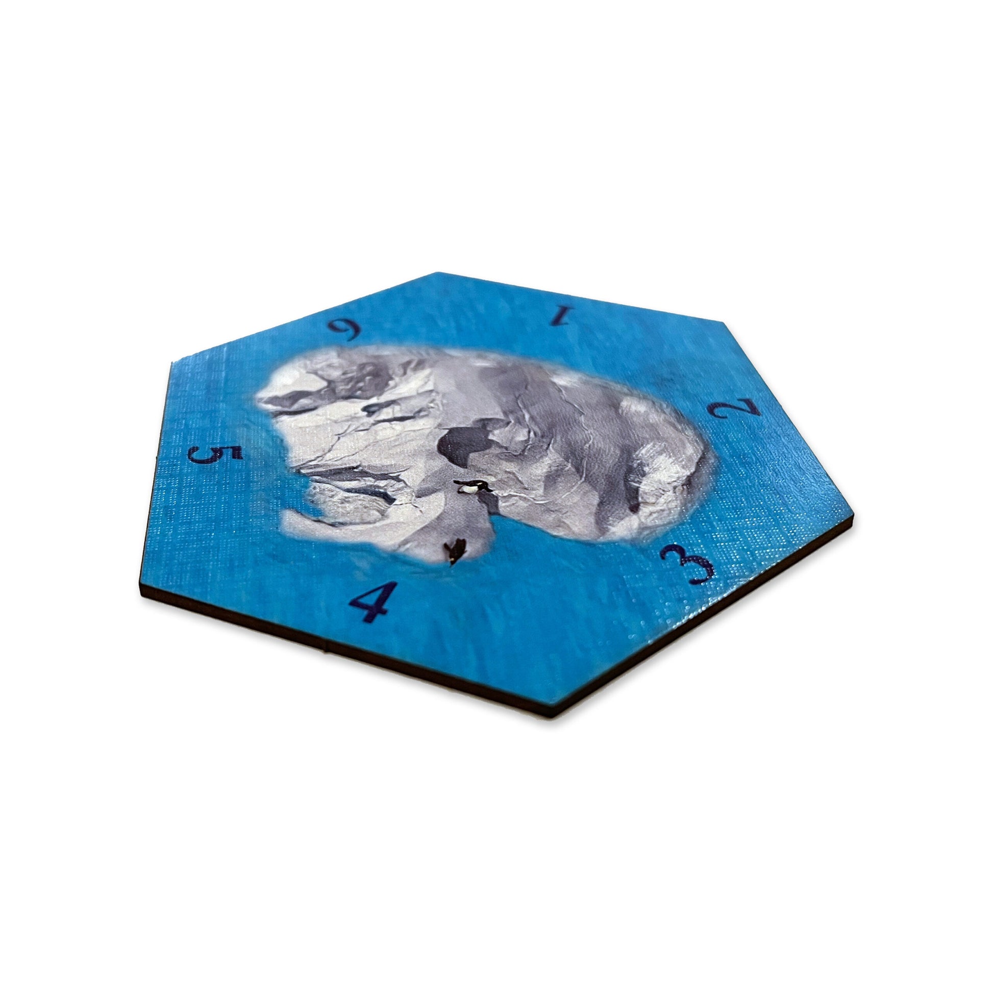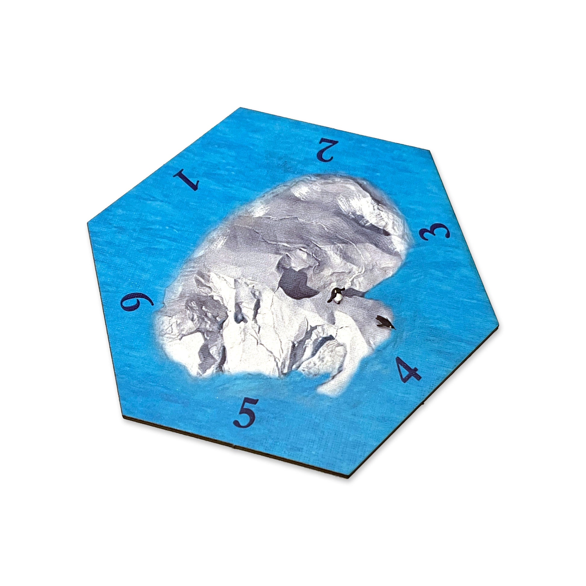 The Iceberg Hex Expansion provides a new level of gameplay and is compatible with Catan's Seafarers expansion. When the number on the iceberg is rolled, the player will roll a die. A ship on that number will be destroyed.