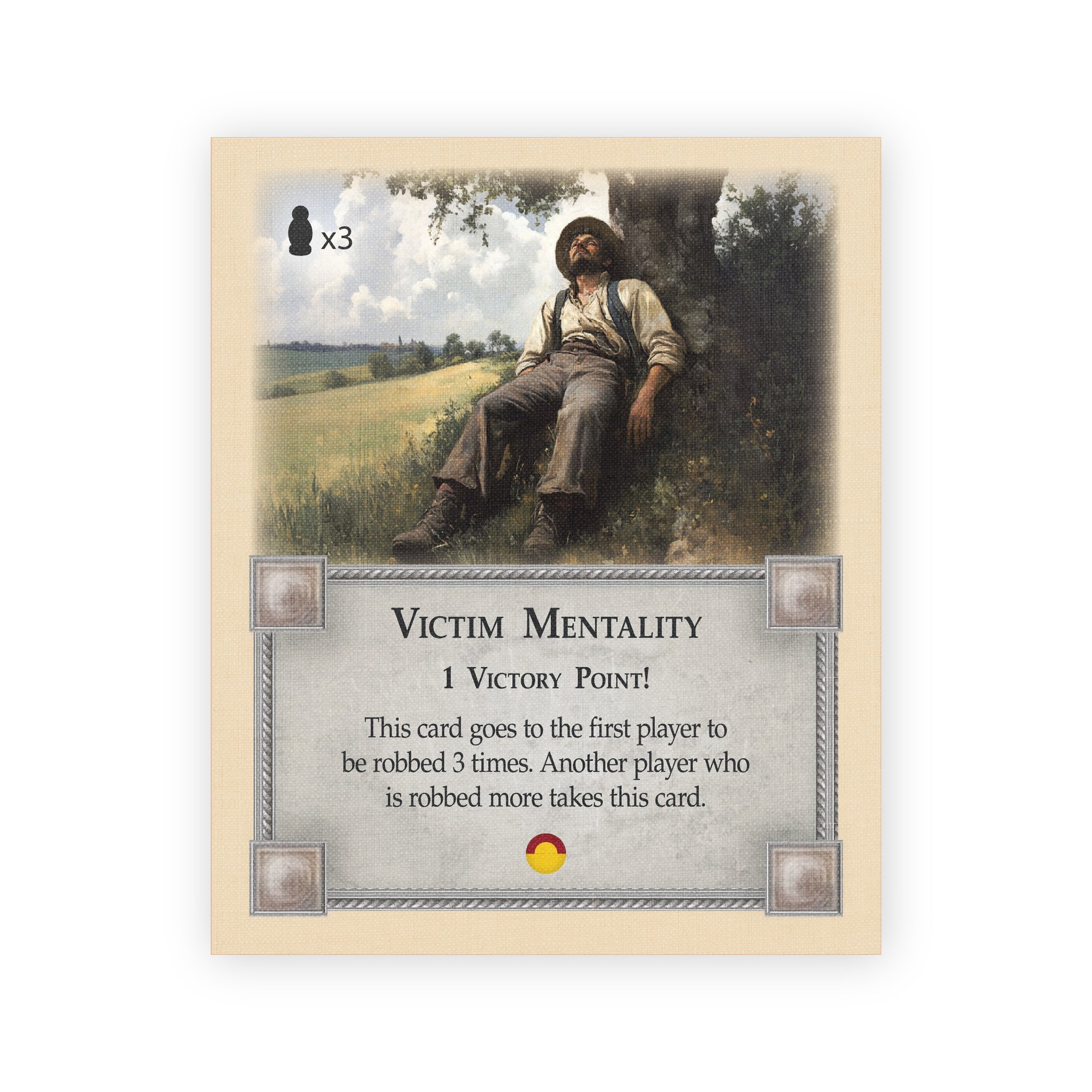 This card assigns the title "Victim Mentality" to the first player to be robbed three times during a game. Another player who is robbed more takes this card.